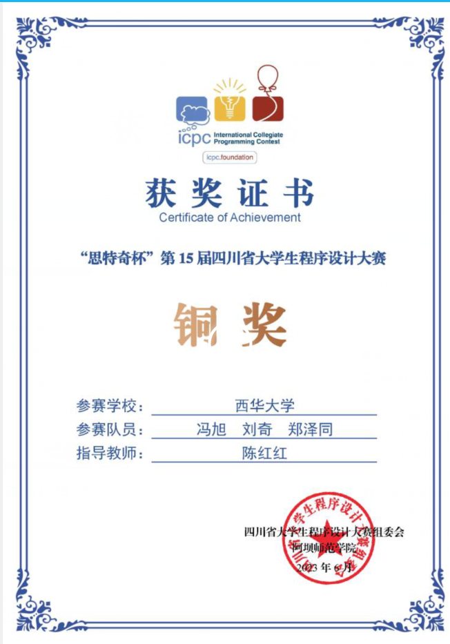 通过定期训练,实验室队员的计算机综合能力得到了很大的提升。2023年,bevictor伟德ACM实验室在团体程序设计天梯赛、百度之星程序设计大赛、全国高校计算机能力挑战赛、蓝桥杯、睿抗机器人开发者大赛等榜单赛事中斩获佳绩。团体赛天梯赛全国总决赛团队三等奖,省赛二等奖,三等奖;四川省大学生程序设计竞赛两项铜奖;第十一届重庆室大学生程序设计竞赛三项银奖,两项铜奖……个人赛更是满载而归,第五届全国高校计算机能力挑战赛程序设计全国总决赛一等奖8人,二、三等奖18人;睿抗机器人开发者大赛CAIP编程赛道全国总决赛一等奖2人,二、三等奖3人;2023年百度之星程序设计大赛全国总决赛铜奖1人,省奖多人;蓝桥杯国赛、省赛获奖多人……