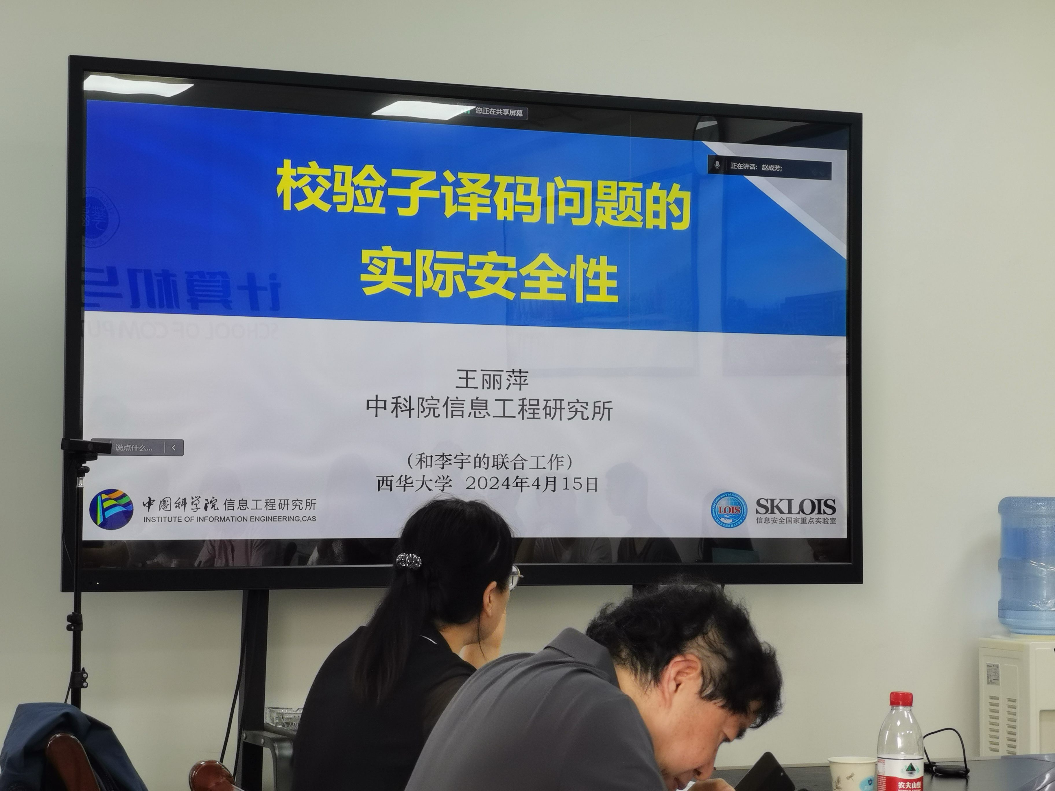 王丽萍教授开展了题为“校验子译码问题的实际安全性”的学术报告。基于编码的公钥密码能够有效抵抗量子计算机的攻击,现已成为后量子公钥密码的重要类型之一,绝大多数基于编码的公钥方案的安全性是基于校验子译码问题。校验子译码问题的实际安全性是指抵抗现有各种攻击的能力,精准地估计相应的公钥密码方案的具体安全性和选择方案的参数集。王教授介绍了目前求解校验子译码问题最好的通用算法——信息集合译码(ISD)算法的发展历史、一般框架、关键技术点,并详细讨论MMT型的ISD算法以及王教授团队的主要结果。