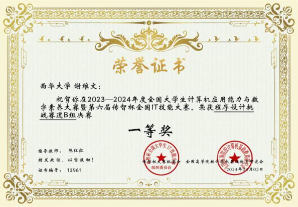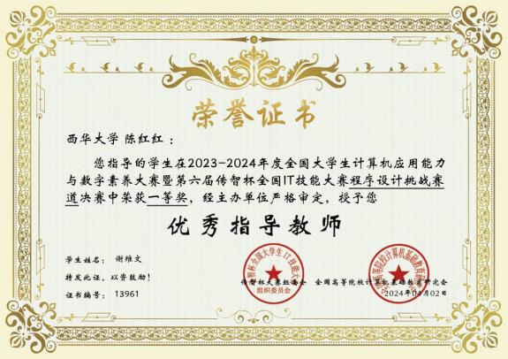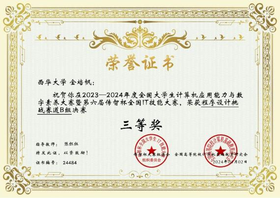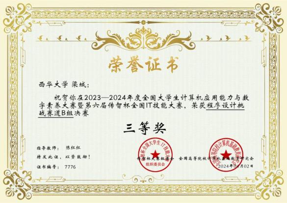 近日,我校伟德bv国际体育学生在第六届传智杯全国IT技能大赛—程序设计挑战赛全国总决赛中,取得优异成绩。其中,谢维文同学荣获全国一等奖,周世阳、李绍杰同学荣获全国二等奖,梁城、金培帆同学荣获全国三等奖,指导老师陈红红荣获优秀指导教师。