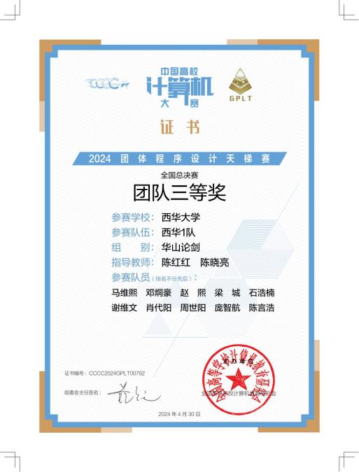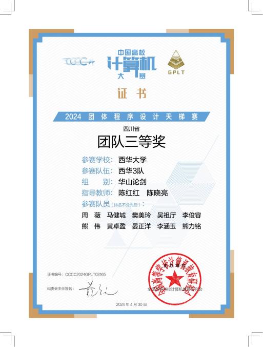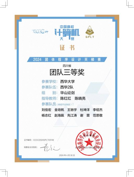 近日,由全国高等学校计算机教育研究会主办的第九届中国高校计算机大赛-团体程序设计天梯赛在线上、线下同时举行。我校3支队伍参加了在成都信息工程大学举办的线下比赛,经过3小时的拼搏,斩获佳绩,全员获奖。获全国总决赛团队三等奖1项,四川省团队三等奖2项。同时,来自2021级软件工程专业的李绍杰同学荣获全国总决赛个人二等奖,2022级计算机科学与技术专业的谢维文和石浩楠同学荣获全国总决赛个人三等奖。