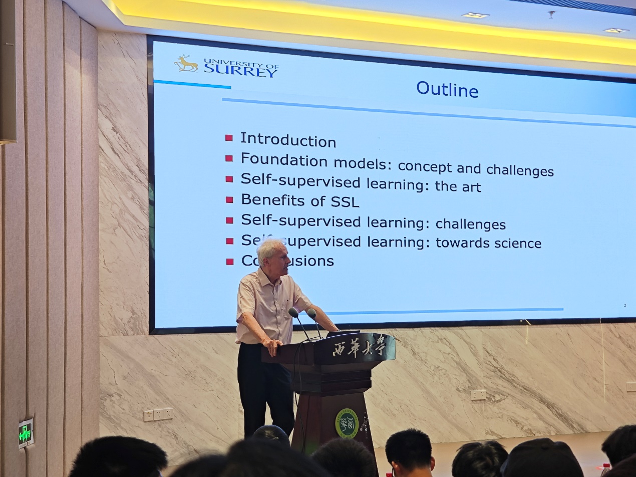 欢迎仪式结束后,与会人员进行了合影留念。随后,Kittler教授在bevictor伟德学术交流中心报告厅做了题为《The Benefits and Challenges of Self-supervised Learning》的学术报告。报告中,Josef教授详细介绍了自监督学习在构建人工智能基础模型中的优势和挑战,吸引了众多师生的积极参与和热烈讨论。自监督学习因其无需数据标注,避免标注噪声的误导,较小规模训练集需求,以及能够更直接地进行数据建模等优势,正得到广泛关注。Kittler教授还探讨了多种自监督学习的方法和启发式策略,并展示了其团队在该领域的最新研究成果。