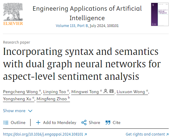 论文5:Incorporating syntax and semantics with dual graph neural networks for aspect-level sentiment analysis发表在国际顶级学术期刊《Engineering Applications of Artificial Intelligence》上。论文第一作者2021级研究生王鹏程,通讯作者为唐明伟教授。