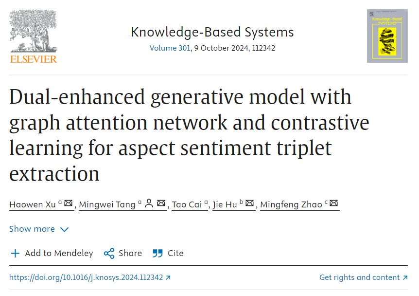 论文2:Dual-enhanced Generative Model with Graph Attention Network and Contrastive Learning for Aspect Sentiment Triplet Extraction,由唐明伟教授担任通讯作者,第一作者为2022级研究生徐皓文,已被国际顶级学术期刊《Knowledge-Based Systems》接受并在线发表。