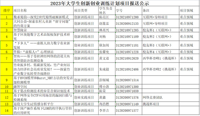 根据《关于组织申报2023年大学生创新创业训练计划项目工作的通知》要求,经学院各项目申报,学院组织领导、老师进行项目评审。现将14项推荐项目排名予以公示,公示时间为2023年5月26日至28日,若有异议请联系谭璐薇老师87720557。