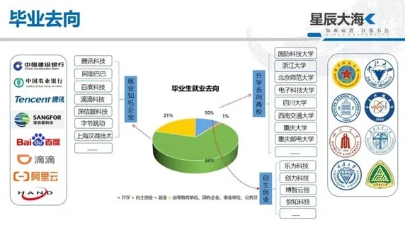有很多学长学姐毕业后在知名企业腾讯科技、阿里巴巴、百度科技等工作;也有学长学姐前往国防科技大学、浙江大学、北京师范大学、四川大学、电子科技大学等深造;还有学长学姐进行自主创业,创办了乐为科技、创力科技、博智云创科技等企业。