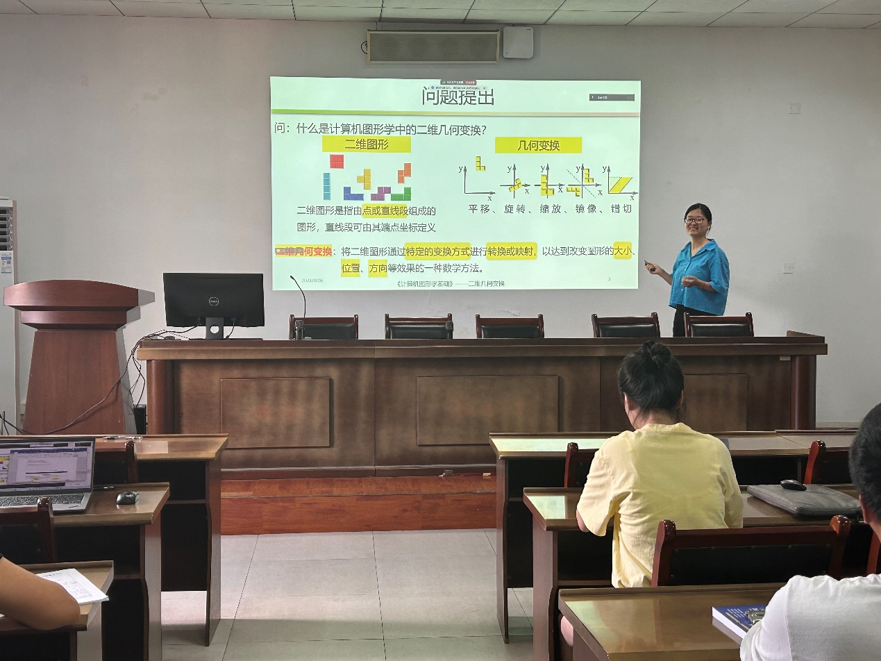 活动开场,新进教师丰慧芳老师进行试讲,主题为《计算机图形学基础——二维几何变换》。丰老师通过动画和游戏的方式引入主题,详细讲解了二维几何变换的原理。她结合图文实例,并以自身举例直观地解释了平移概念,使得内容易于理解。试讲后,资深教师们积极反馈,提出了如增加课堂提问以提高学生参与度等改进意见。