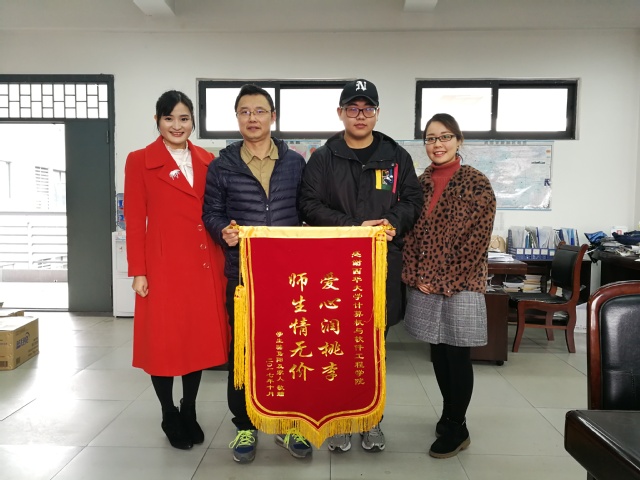 12月11日下午,骆隽阳同学把一面“爱心润桃李师生情无价”的锦旗送到了学院,以感谢学院对他的关爱与帮助。