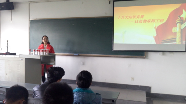 为庆祝党的十九大胜利召开,了解和掌握学生对十九大报告精神的认知情况,引导学生将党建知识内容学深、学懂、学透。11月1日下午3点,伟德bv国际体育15级物联网工程专业在教室6C-421举行“十九大”知识竞赛,此次比赛由助理辅导员杨丽萍主持,15级物联网工程专业全体学生参与。