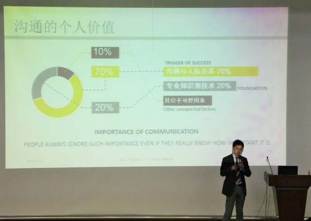 张总以一句“This is an ordinary day or not”打开主题,以阿里巴巴的纪录片片段作为开头,讲座由此拉开序幕。张总详细讲述了职场沟通中意想不到的隐形目的、职场沟通的心理学和行为学依据以及由此产生的职场沟通法则、专业沟通的5大障碍和行为惯性、专业沟通结构化的障碍突破方式与技巧、标准说服模型和场景化沟通等几点。在互动环节中,张总监通过一个双手交叉小实验,和同学们相互交流,他希望在座师生在现在或者以后的职场生涯中勇于做出改变。同时,张总监引用了马云“沟通就是讲故事”和苹果广告词“Think different”,启迪我们在今后的职场中应该时刻注意沟通的艺术和思维方式的改变。接着,张总监简单剖析了马斯洛需求层次理论和三位一体大脑理论,告诉我们在各种不同情景下应理性思考,不被情绪所左右。最后,他强调了,在今后的职场中,我们每个人就是一件商品、一个品牌,我们需要把自己销售给企业。所以,如何把自己销售给企业,是我们在大学所需要学习思考的。