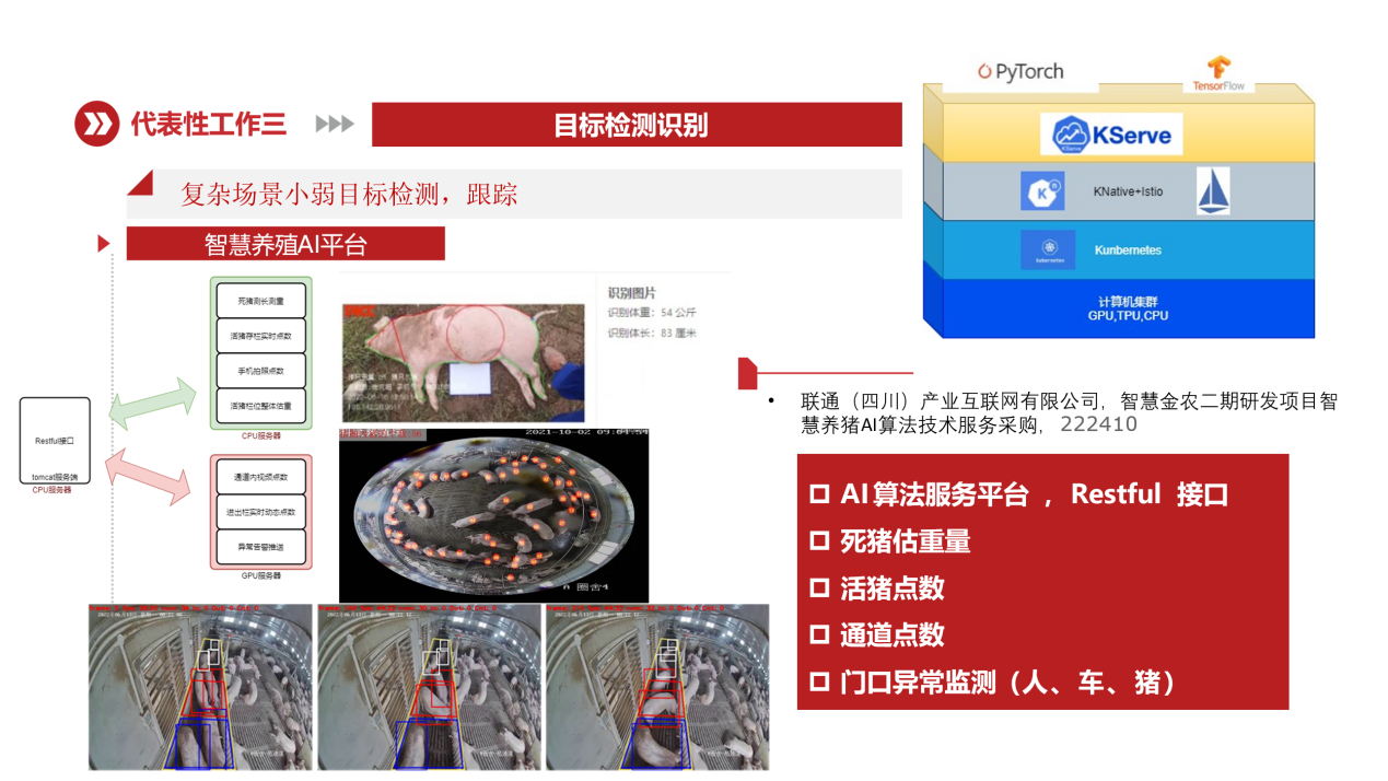 9、中国联通四川,智慧养殖AI服务平台,2224102022.09-2023.06。实现多场景目标检测、计数与跟踪。