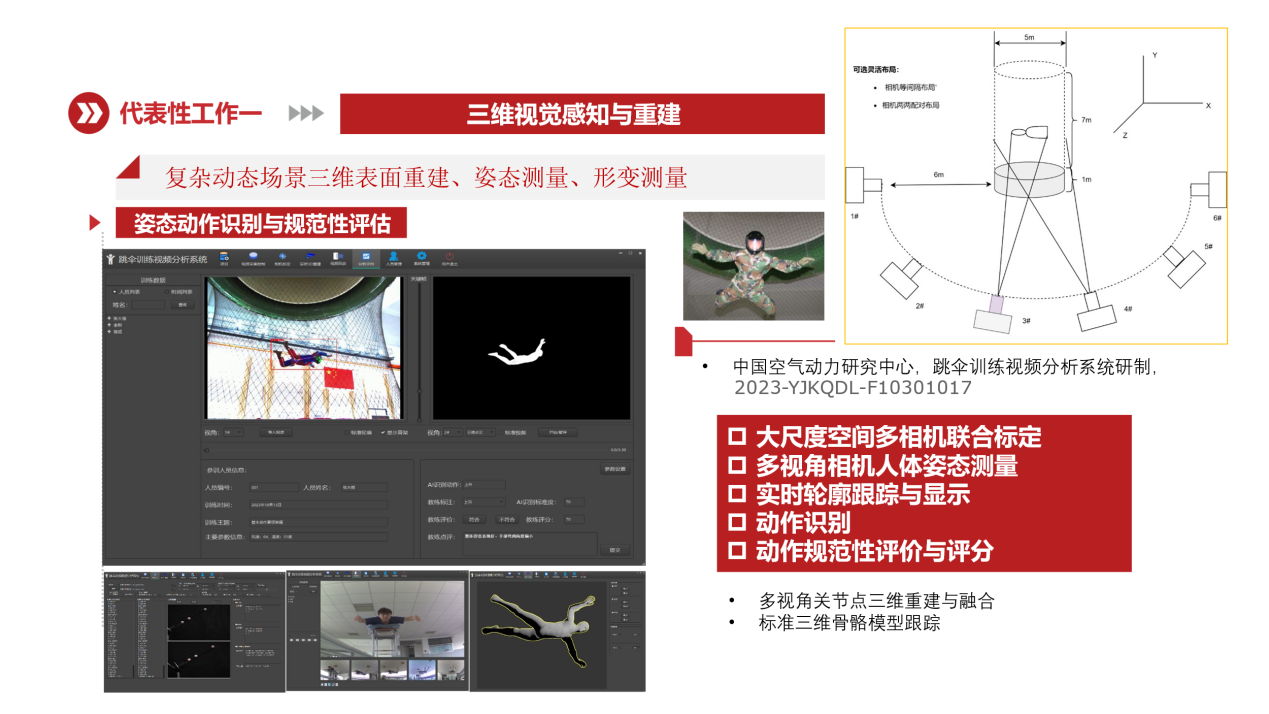 7、中国人民解放军部队,跳伞训练视频分析系统研制,2023.6.30-2023.12.30。项目完成大尺度空间多视角相机标定、姿态定位于识别、动作行为识别。
