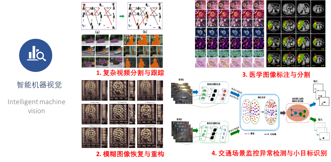图像理解与计算机视觉方向,以大数据分析、深度学习等工具,研究图像视频分割、图像去模糊和超分辨、视频对象跟踪、生成对抗学习、图像去噪、增强、复原和特征提取,多目标检测、识别与跟踪,生物特征鉴别,事件检测及行为理解,多源图像智能处理及其应用。
