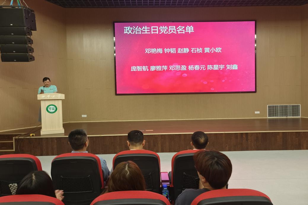 首先,李欣副书记宣读政治生日党员名单,分别是“政治生日1周年”:庞智航、廖雅萍、邓思盈、杨春元、陈星宇、刘鑫;“政治生日2周年”:石桢、黄小欧、赵静;“政治生日8周年”:钟韬;“政治生日9周年”:邓艳梅。分别由李兵委员、杨万能主任和李欣副书记为他们颁发生日贺卡并合影留念。