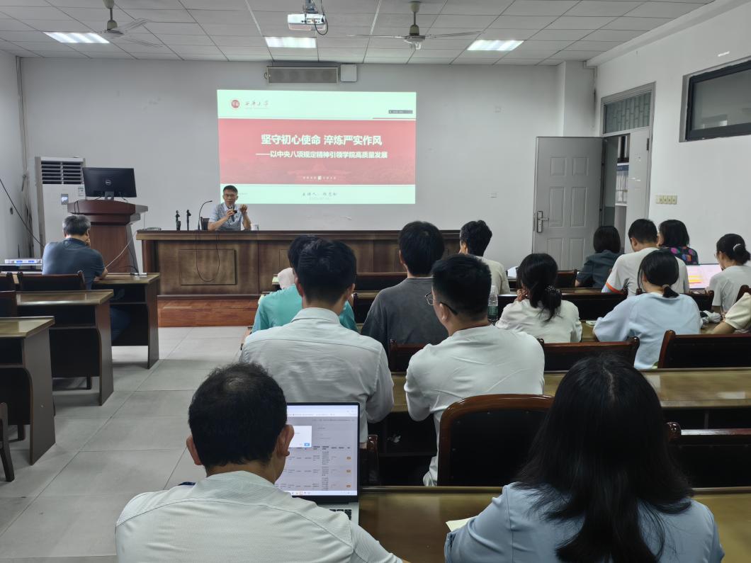 会上,杨志松同志以“坚守初心使命 淬炼严实作风——以中央八项规定精神引领学院高质量发展”为题讲授专题党课。他结合学院实际,从“深刻领悟八项规定精神的核心要义与时代价值;筑牢思想防线、涵养优良作风,推动精神落地生根;发挥战斗堡垒作用,立足岗位职责,务求知行合一;以“赶考”精神书写新时代作风答”卷四个方面展开,强调党员干部要始终以中央八项规定精神为标尺,筑牢廉洁自律防线,将严实作风转化为推动教学科研、人才培养、社会服务的内生动力。