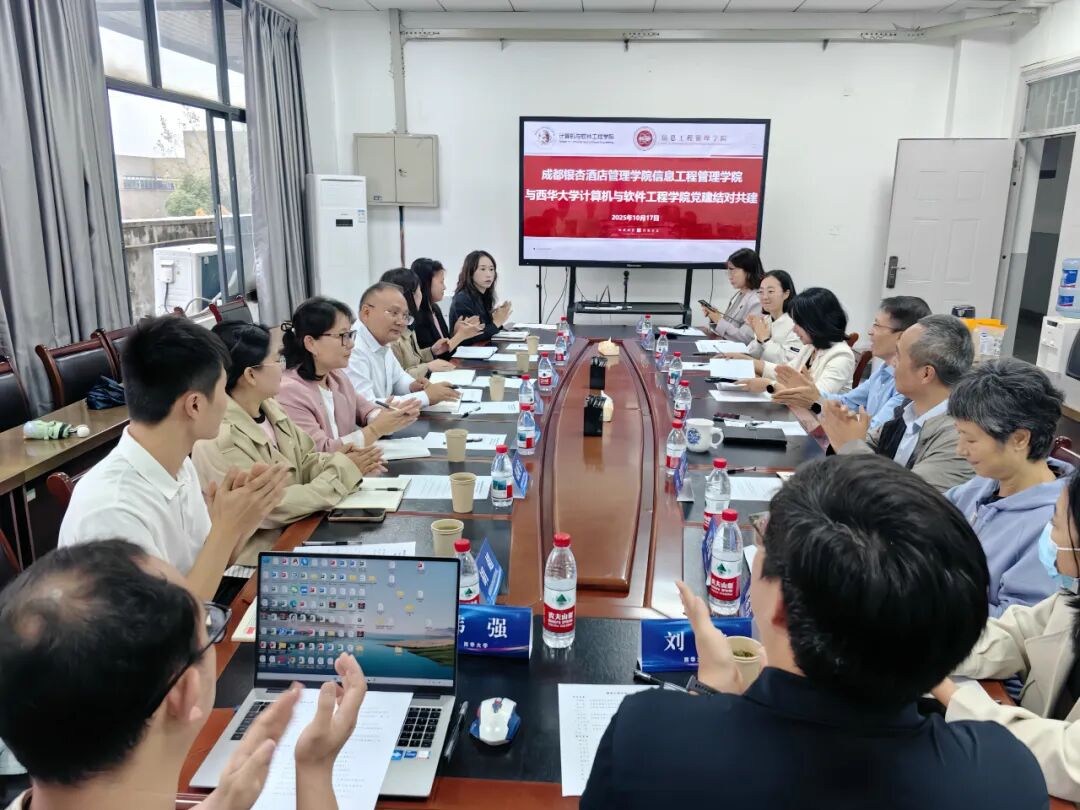 成都银杏酒店管理学院信息工程管理学院院长何明星对其学校及学院的基本情况进行介绍,包含学校概况以及学院的发展历程、师资队伍、学科门类、专业设置、组织架构与职责分工,充分展示了学院优质的教学资源与完善的育人平台。党委书记杨婷介绍了学院党建工作概况,并重点阐释了以“党建引领专业提升,强化人才培养效能”为主题的党建结对共建方案。