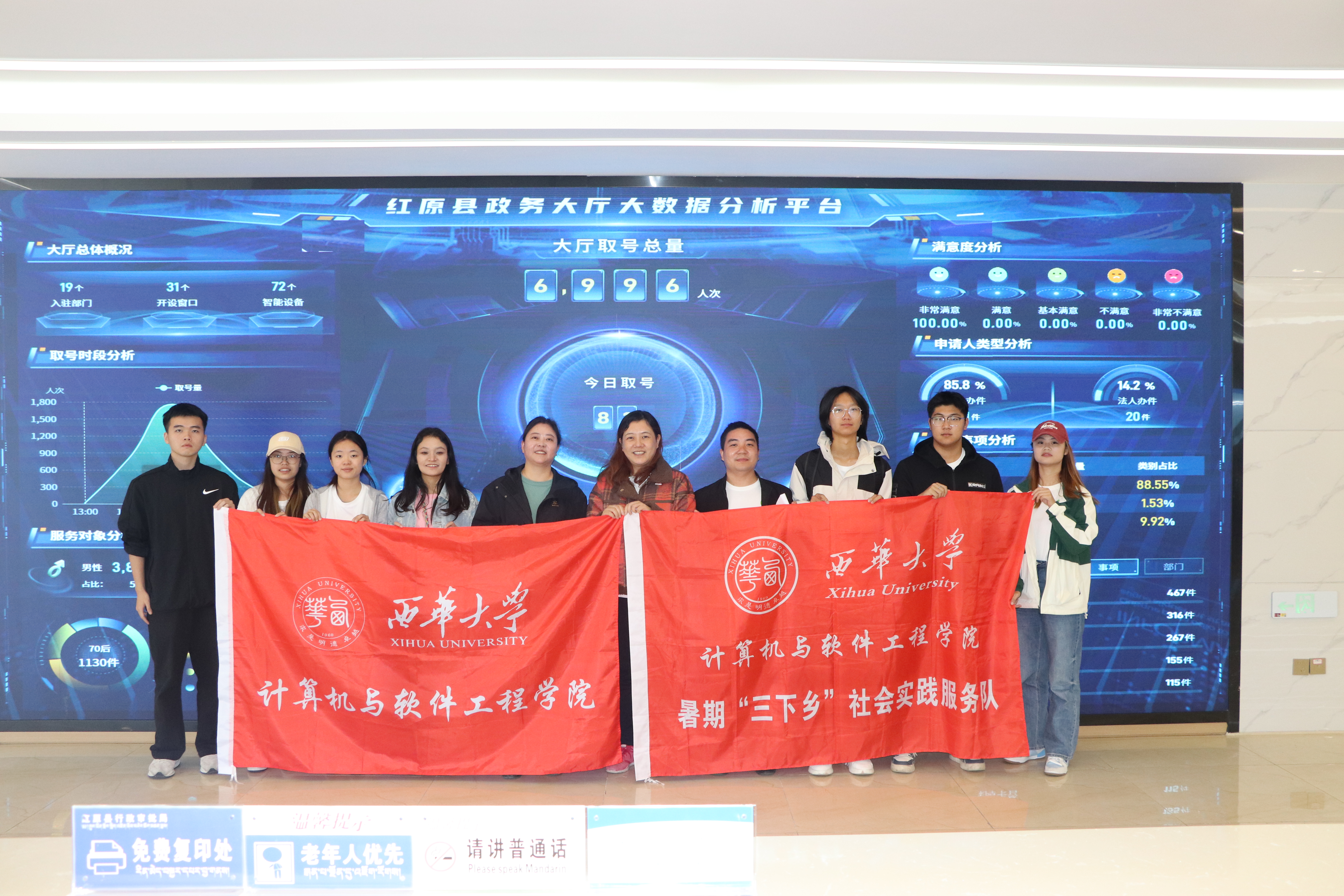 在红原县政务服务股股长达娃措的带领下,实践团队成员前往红原县政务服务大厅实地参观学习交流。首先映入大家眼帘的是大厅正中央的红原县政务大厅大数据分析平台,屏幕上显示着大厅总体概况、取号时段分析、服务对象分析、取号总量等实时数据,展示了红原县“互联网+政务服务”智能化运用成效。