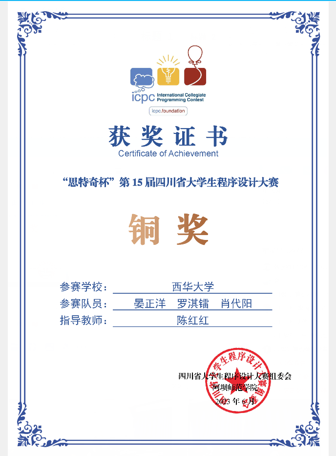 通过定期训练,实验室队员的计算机综合能力得到了很大的提升。2023年,bevictor伟德ACM实验室在团体程序设计天梯赛、百度之星程序设计大赛、全国高校计算机能力挑战赛、蓝桥杯、睿抗机器人开发者大赛等榜单赛事中斩获佳绩。团体赛天梯赛全国总决赛团队三等奖,省赛二等奖,三等奖;四川省大学生程序设计竞赛两项铜奖;第十一届重庆室大学生程序设计竞赛三项银奖,两项铜奖……个人赛更是满载而归,第五届全国高校计算机能力挑战赛程序设计全国总决赛一等奖8人,二、三等奖18人;睿抗机器人开发者大赛CAIP编程赛道全国总决赛一等奖2人,二、三等奖3人;2023年百度之星程序设计大赛全国总决赛铜奖1人,省奖多人;蓝桥杯国赛、省赛获奖多人……