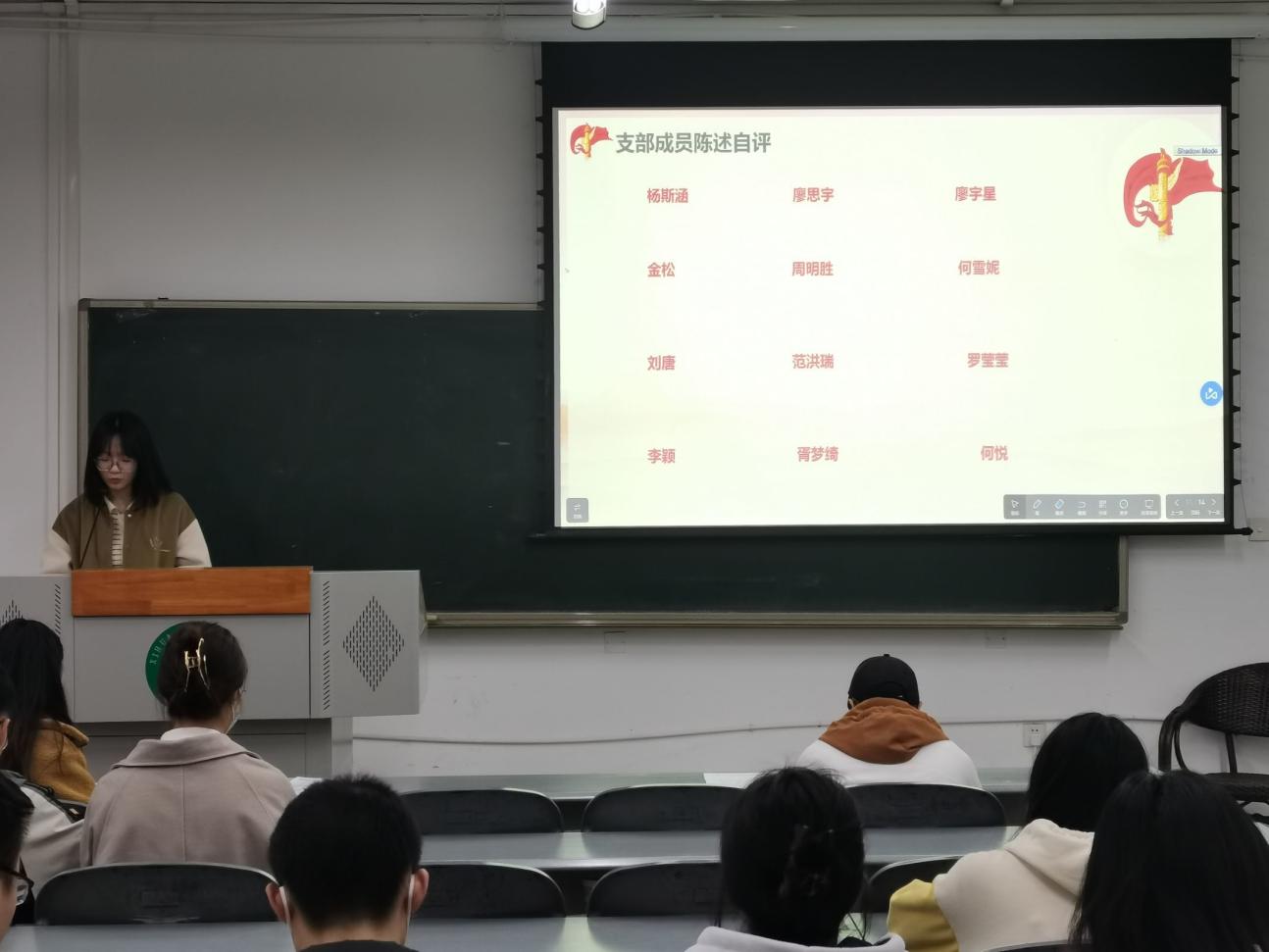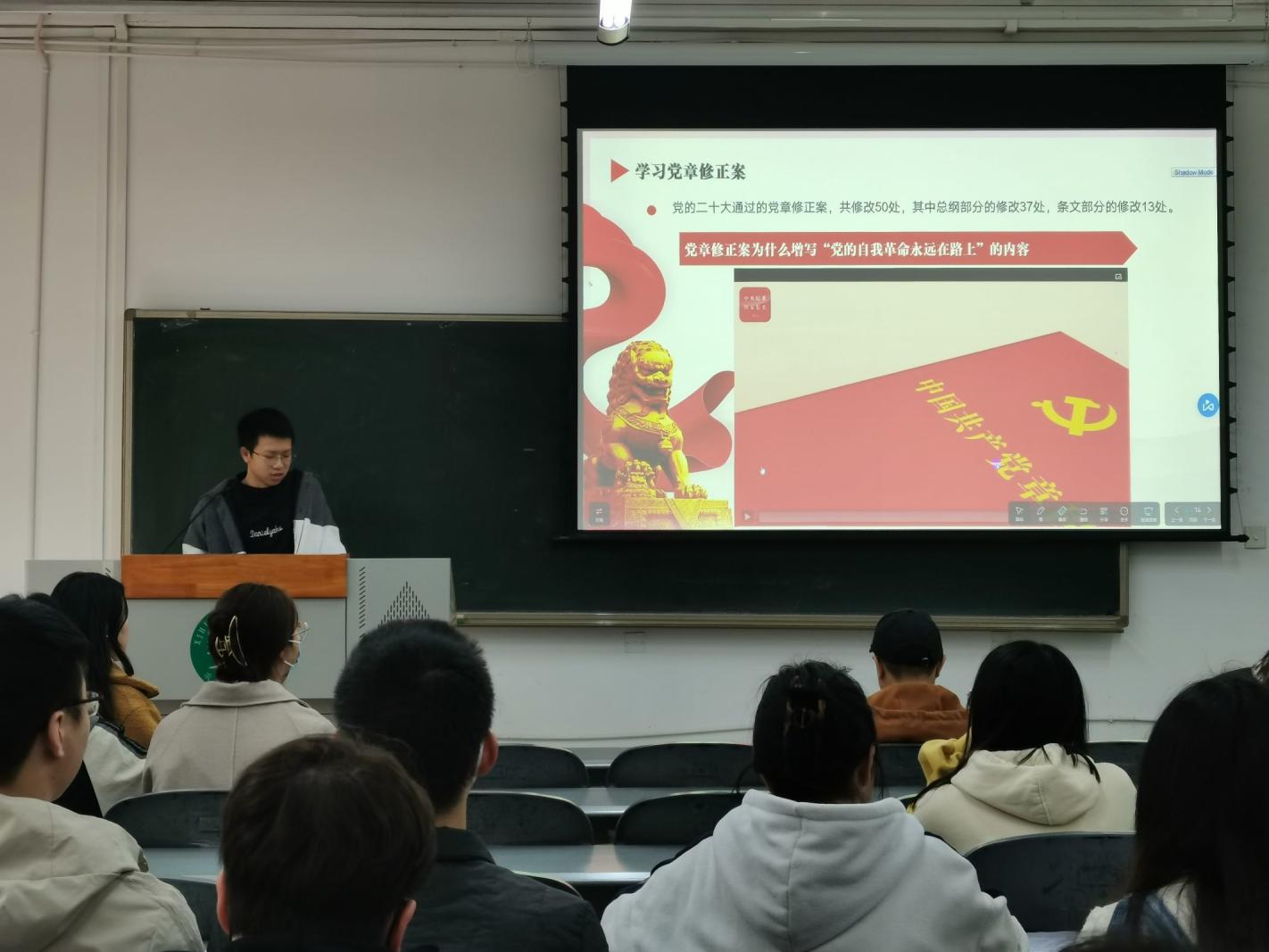 会上,主持人和党支部书记谭璐薇老师带领全体党员认真学习领会党的二十大精神,她分别对党的二十大报告、党章和党章修订案进行了阐述。