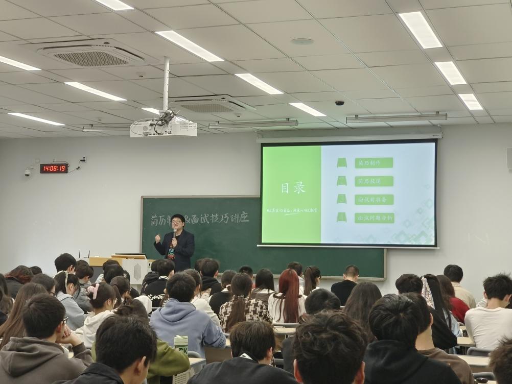 鲁经理从简历制作、简历投递、面试前准备、面试问题分析四个方面开展讲解,经过知识讲座和抢答互动,同学们学习到许多关于简历制作与面试的技巧。