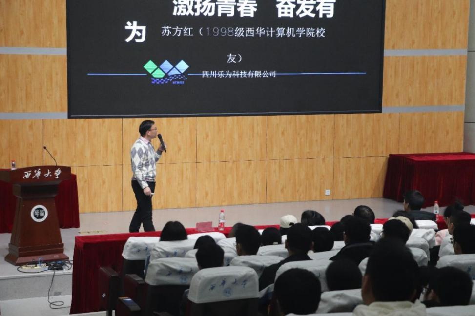 11月22号晚19:00,伟德bv国际体育在四教报告厅举办了主题为“激扬青春,奋发有为”的西华讲堂,本次西华讲堂邀请了四川乐为科技公司创始人、全国青年川商副会长、98级优秀校友苏方红主讲。学院教师代表、学生代表300余人参加。