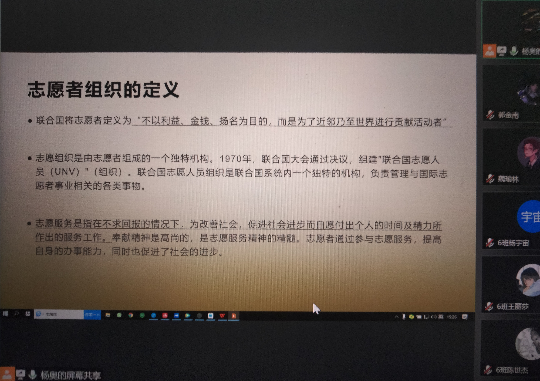 11月25日下午15:30,bevictor伟德郫都校区伟德bv国际体育计算机类22-6班开展了线上“做优秀志愿者,圆复兴中国梦”志愿者培训课。本次课程旨在向同学们介绍志愿者精神,同时教导同学们如何成为一个优秀的志愿者。本次课程由杨奥主讲,6班同学全部参加课程。