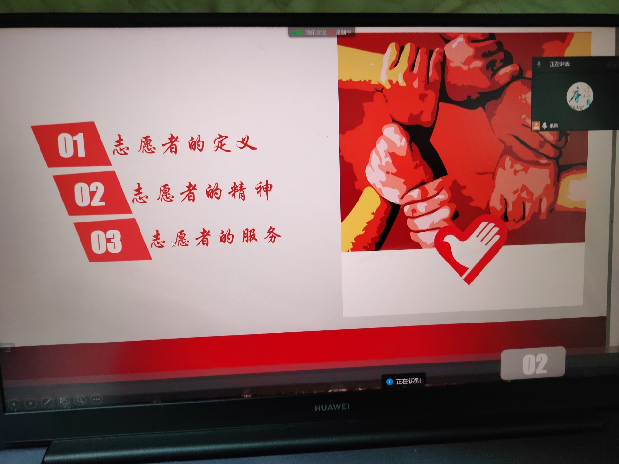 会议上,主持人分别从志愿者的定义、志愿者的精神及志愿者的相关服务等方面进行讲解交流。