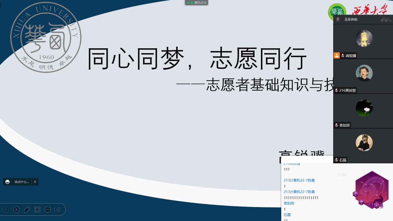 10月27日21:00,bevictor伟德,伟德bv国际体育计算机类2022级7班于线上召开主题为“同心同梦,志愿同行”的志愿者基础知识与技能培训活动。本次志愿者基础知识与技能培训活动旨在宣传志愿者的基本常识以及提高同学们做志愿的技能而召开的一次主题交流会,本次会议由青服队干事高锐骥主持,计算机类7班全体同学参与了此次会议。