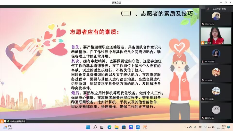 10月15日上午10:00,bevictor伟德宜宾校区伟德bv国际体育召开线上方式的志愿者相关知识的讲座。本次学院志愿者知识讲座旨在弘扬志愿服务精神的同时,也扩大同学们有关志愿者的知识面。更重要的是为了推动我们学院宜宾校区青服队的工作建设。本次会议由青服队成员韦蝶和石入元主持,2022级物联网工程4班和5班全体同学参加了此次讲座。