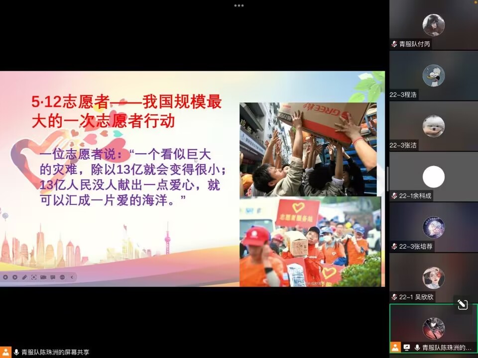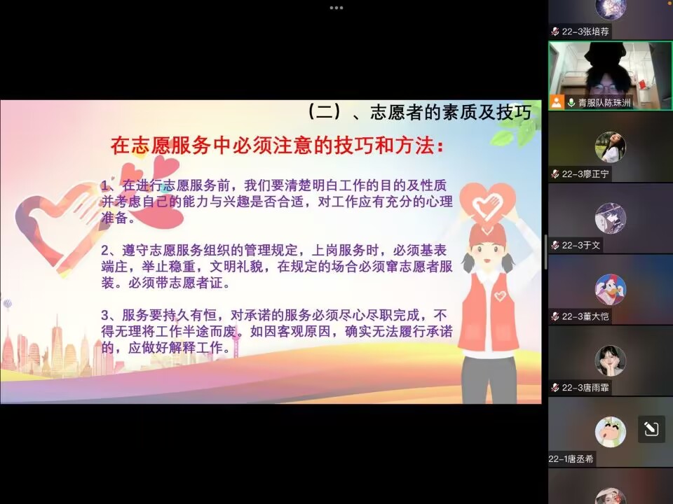 此次讲座通过腾讯会议,主讲人用PPT的形式向同学们展示了讲座内容,内容主要分为两个部分,包括志愿者服务理念的知识和志愿者技能培训。
