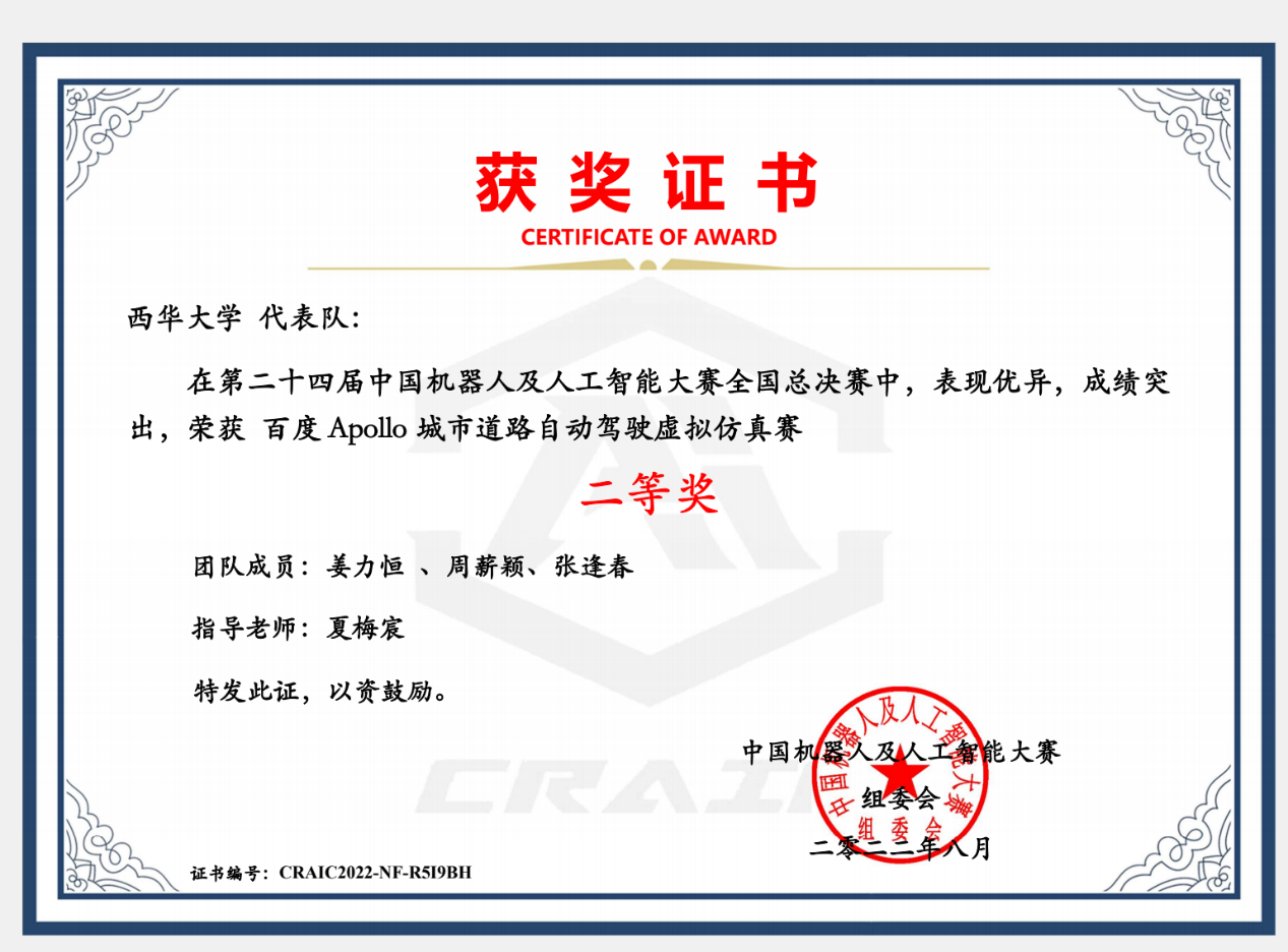 8月25日,第二十四届中国机器人及人工智能大赛组委会公布了全国总决赛获奖名单。伟德bv国际体育学子姜力恒 、周薪颖、张逢春组成的队伍“代码写的都队”在分赛道“百度Apollo城市道路自动驾驶虚拟仿真赛”中喜获全国二等奖;由甘佳鑫,严雨雨,程皓组成的队伍“阿甘队”喜获省级优秀奖;由张鹏、范宇、罗仟行组成的队伍“AI Warriorv”喜获人工智能创新赛省赛三等奖。