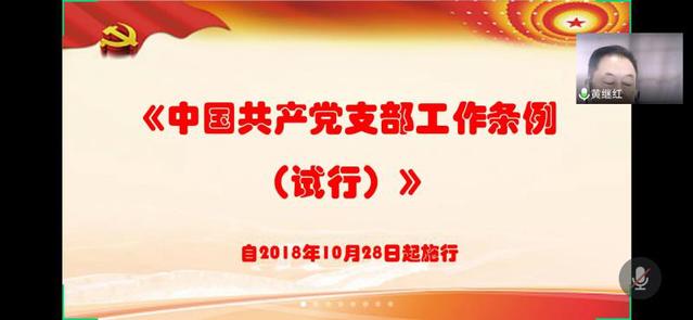 7月10日,支部通过线上会议的方式开展了“学习中国共产党支部工作条例”的专题教育党课。党课由学院党委书记黄继红同志担任主讲人,支部书记盛小兰同志主持,物联网学生党支部全体党员参加。黄书记以制定该《条列》的重要意义为切入点,讲解了党的组织体系,由点到面,由理论到实际。而后结合历史和实际情况讲述了党支部的职责定位、工作原则与工作机制,党支部设置的条件、成立的流程,基本任务,组织生活以及支部委员会的建设。黄书记强调高校党支部的根本任务是立德树人,要加强自学,互相督促,养成终身学习的良好习惯。除此以外,黄书记指出了目前支部存在的问题,并提出了相关建议。