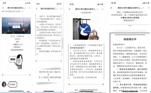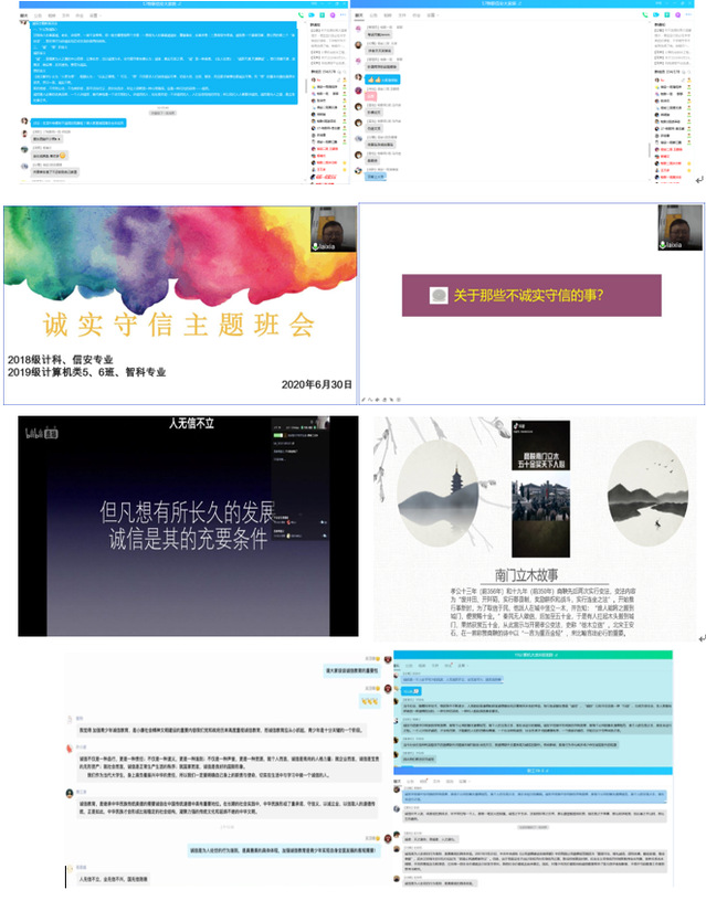 2017级物联和信安专业在班级QQ群开展诚信主题教育活动,辅导员刘凤丽向同学普及了什么是诚信?“诚”和“信”的含义分别是什么?开展“生活中有哪些不诚信的现象?”主题讨论。2018级计科、信安专业、2019级计算机类5、6班、智科专业总计400余人在腾讯课堂召开了关于诚实守信的主题班会,辅导员赖霞老师通过案例分析给同学们讲述了诚实守信的重要性。计算机类9-13班辅导员李德友通过网络平台开展主题为“诚实守信”的线上宣讲会,以近期“歌手仝卓伪造学籍档案”热点事件为议题、回味经典的儿时故事《狼来了》、商鞅“南门立木”的典故来引导同学们参与讨论。2018级软工、信安,2019级计算机类7-8班、信安专业辅导员盛小兰在班级群开展“诚信为何?诚信有何重要?”的线上主题讨论,同学们积极参与,达到了预期的效果。