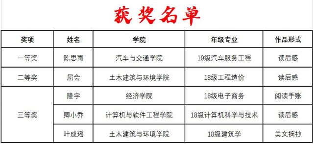 活动从4月6日到4月24日,历时半月有余,同学们读完一本书后,可以任何形式表达自己的感受。参赛选手们认真对待比赛,积极准备作品。最后汽车与交通学院的陈思雨同学荣获第一名、土木建筑与环境学院的屈会和叶成瑶同学荣获第二名、经济学院的隆宇以及伟德bv国际体育的卿小乔同学的作品荣获第三名。