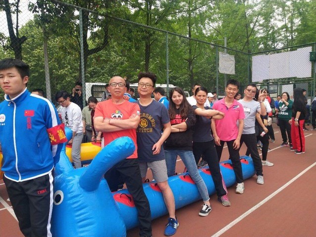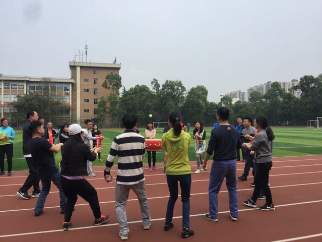 下午,教职工们的热情随着攀升的气温被点燃,运动场上到处是一组组认真练习的队员。跑道上,骑着道具“毛毛虫”的队员们正在赛跑,他们齐心协力,喊着整齐的口号,向着终点跑去。难度系数最高的是“趣味篮球”,参赛人员要把直径近一米的气球准确地投入三米外的充气篮框,需要力量与柔韧性的完美结合,各位队员正全力以赴,女队员王老师,更是化身为“神投手”,五投五中,赢得了宝贵的五分。最后一个项目是鼓动人心,需要一人将球放到比赛用的大鼓上,其余的16人用绳索操纵大鼓颠球,三分钟内颠球数量最多的队伍获胜,队员们全神贯注、小心翼翼地配合着,控制小小的网球在弹性极佳的鼓面跳动,这场比赛考验的是各组队员的耐心、默契……