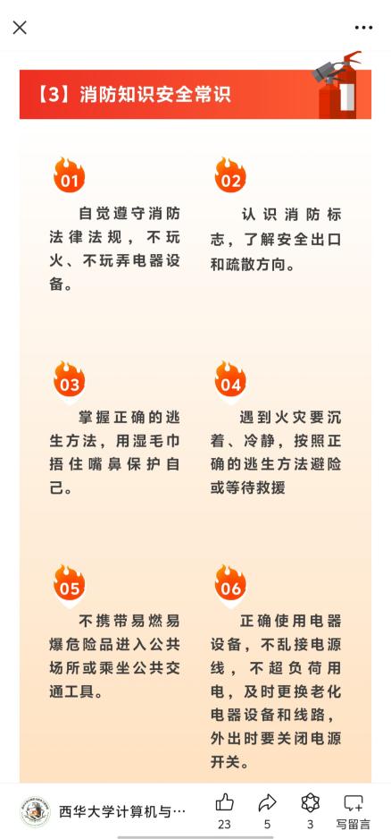 为增强师生消防安全意识,学院通过官网、官方微信公众号等平台科普消防安全知识、展出消防教育成果。在学院官网发布新闻3篇,包括消防安全专题培训、消防实战演练、消防安全教育系列活动总结。在学院官方微信公众号发布推文2篇,包括消防知识科普、消防安全教育系列活动总结。