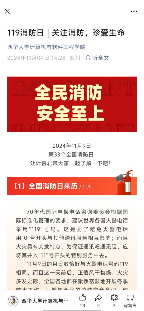 2024年11·9消防月宣传活动,伟德bv国际体育聚焦媒体宣传、宣传阵地、安全教育三个环节,开展了形式多样、内容丰富的系列活动。活动覆盖了全院3000余名学生、120余名教师,宣传效果良好,宣传成果丰富。学院师生在各项活动中深刻认识到消防安全的重要性,增强了消防安全意识,提高了消防应急能力。学院将继续加强消防宣传工作,常态化开展消防安全教育,预防为主,为师生创造更加安全、和谐的工作学习环境。