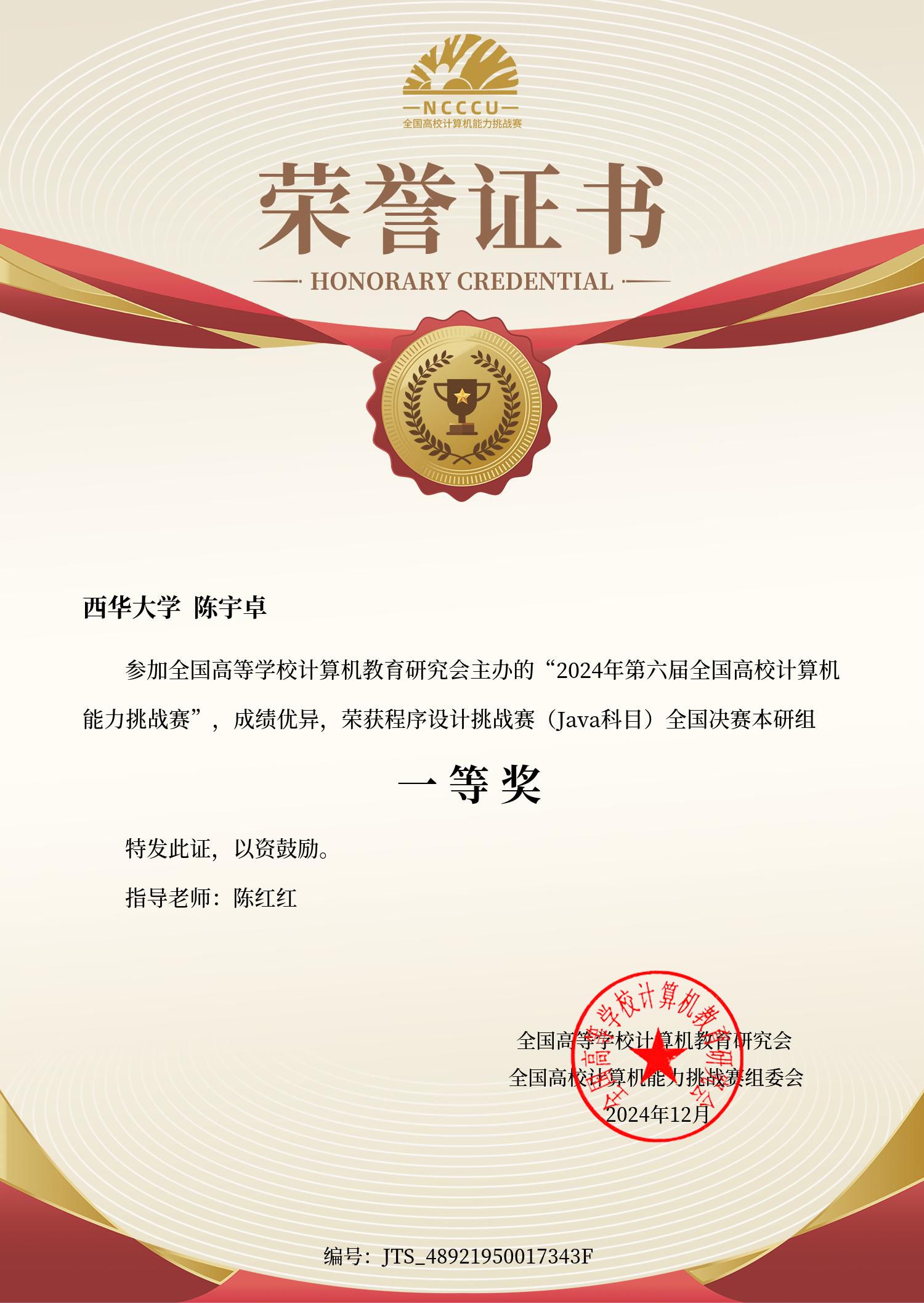 2024年12月,第六届全国高校计算机能力挑战赛全国总决赛中,我校最终获个人赛全国一等奖2项,二等奖赛4项,三等奖6项;团队赛获全国二等奖1项,三等奖1项。